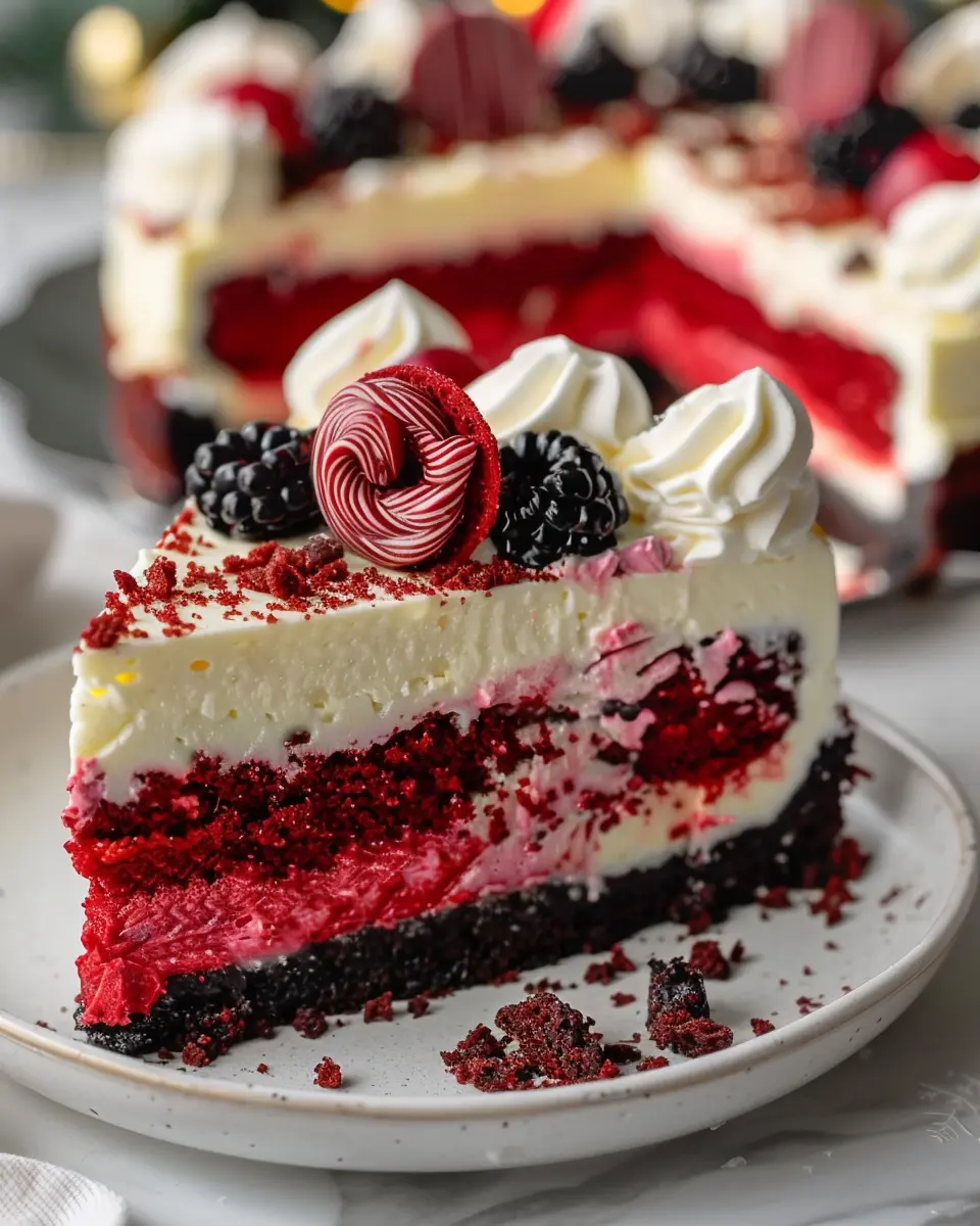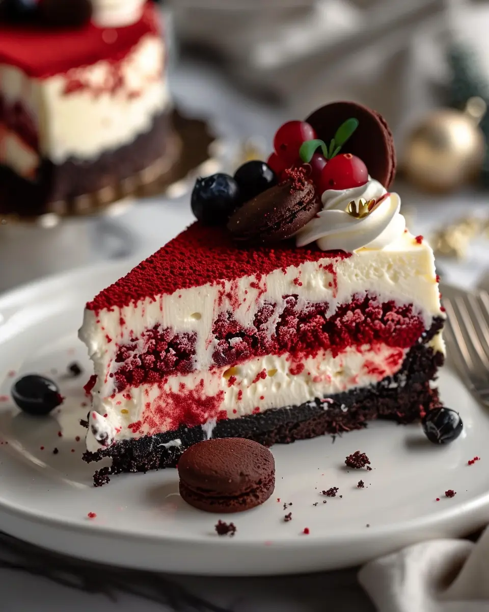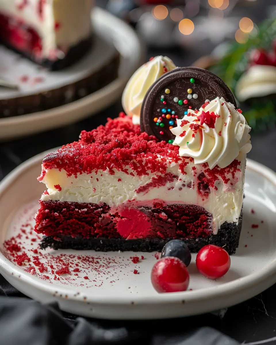 This Christmas Red Velvet Cheesecake is a scrumptious blend of rich chocolate and velvety cream cheese, perfect for holiday celebrations.