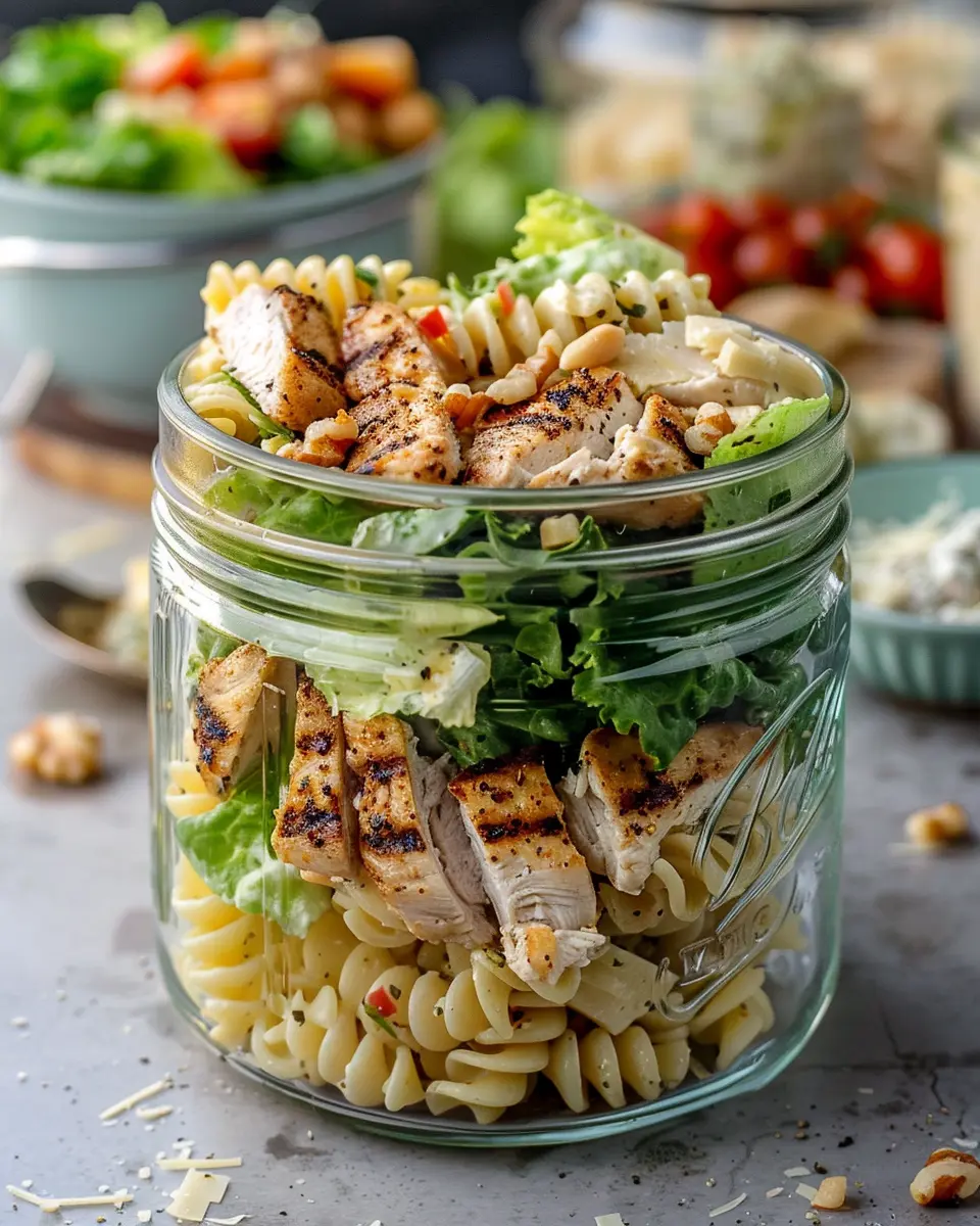 A delicious blend of grilled chicken, pasta, and Caesar dressing layered in jars for a convenient meal prep option.