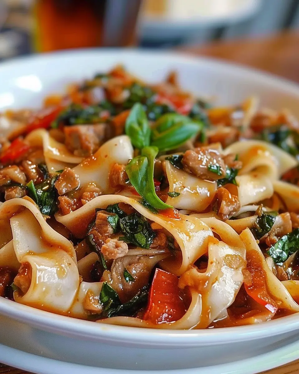 Experience a delightful blend of flavors with Italian Drunken Noodles incorporating turkey bacon for a unique twist.