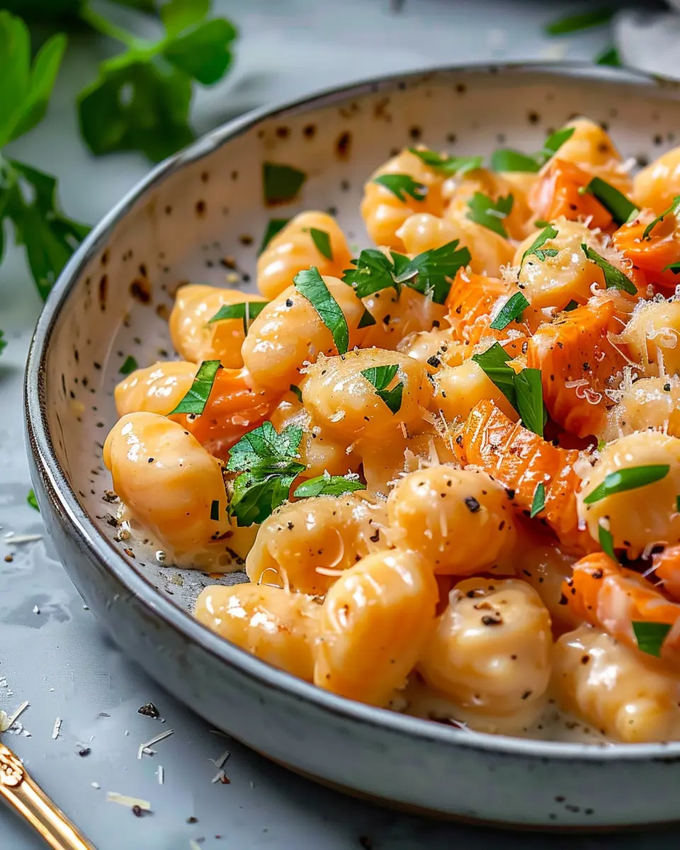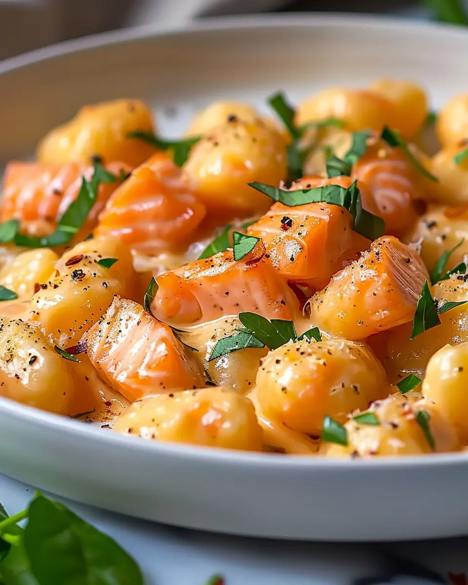 A deliciously cozy dish featuring tender gnocchi, smoky salmon, and crispy turkey bacon.